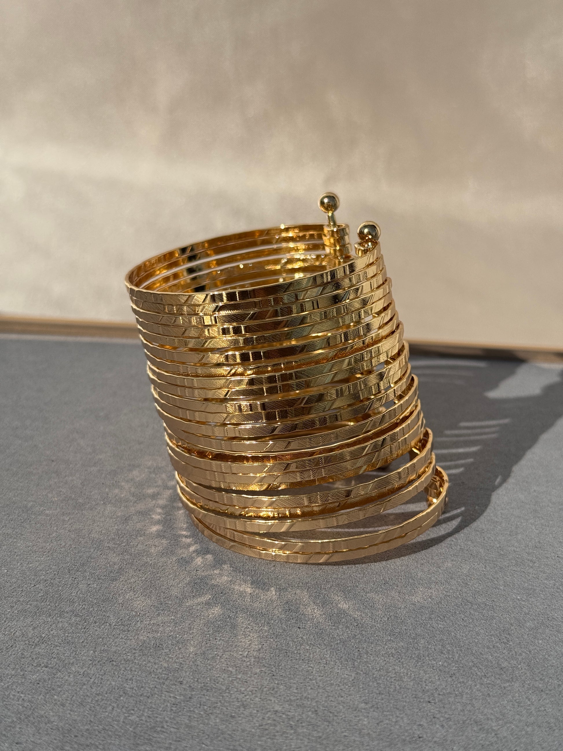 Sleek and modern, this adjustable 18K gold bangle cuff is perfect for daily wear. Crafted as demi-fine jewelry, it features an anti-tarnish finish for lasting shine. A versatile accessory ideal for office or casual outfits, blending elegance with everyday comfort.