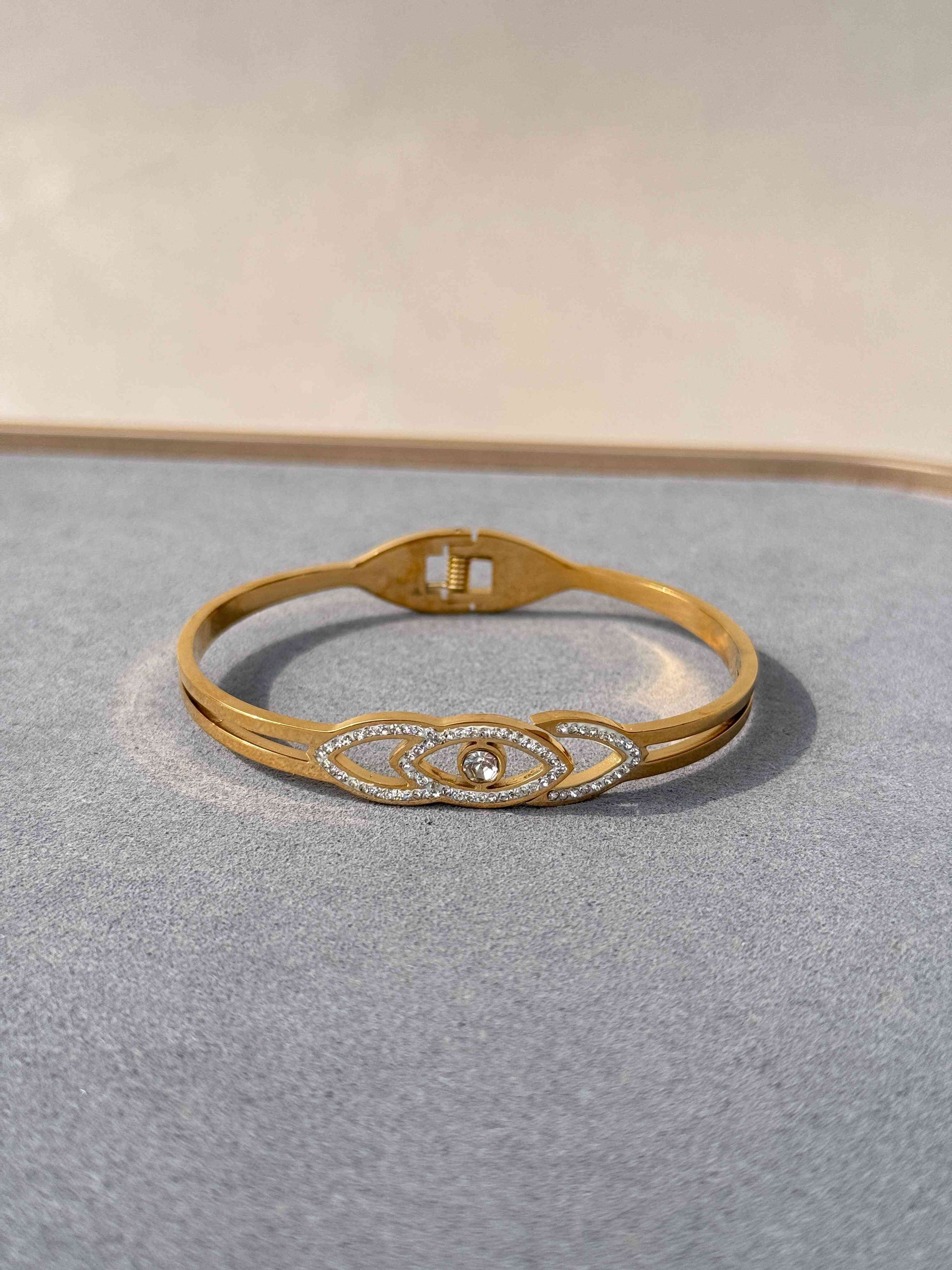 Elevate your style with our 18K GOLD PLATED ANTI TARNISH BRACELET. Made of premium stainless steel, it's water resistant and perfect for daily wear. The elegant and luxurious design features an evil eye for protection on all occasions. Don't miss out on this bold and daring accessory!