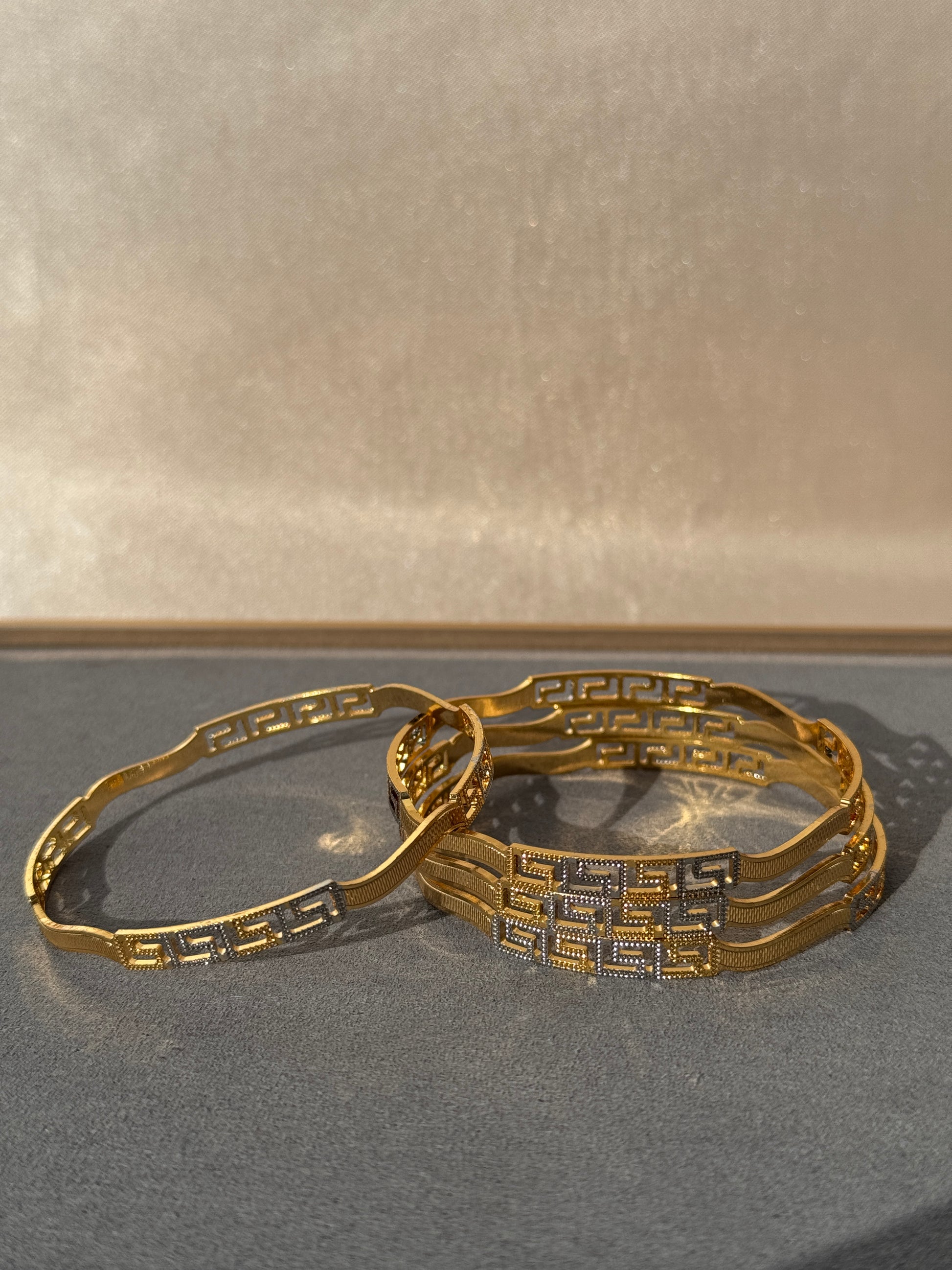 Experience the elegance and durability of our MICRO GOLD PLATED ANTI TARNISH BANGLES. Designed by TKS, these bangles are water resistant and perfect for daily wear. Made with premium quality materials, they add a touch of luxury to any occasion. Say goodbye to tarnishing and hello to an elegant and timeless look.