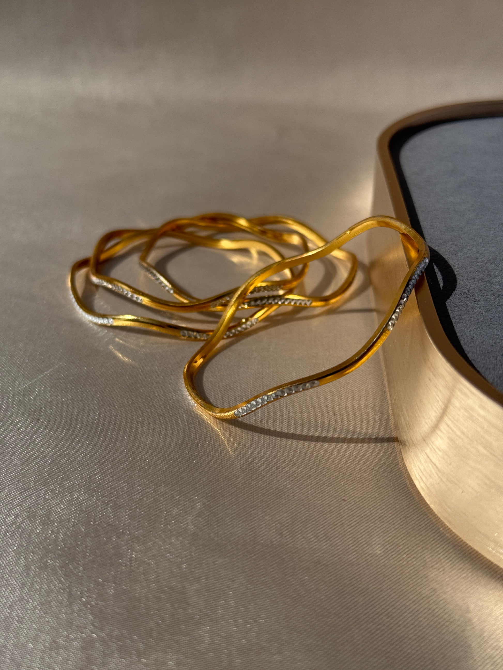 Experience the elegance and durability of our MICRO GOLD PLATED ANTI TARNISH BANGLES. Designed by TKS, these bangles are water resistant and perfect for daily wear. Made with premium quality materials, they add a touch of luxury to any occasion. Say goodbye to tarnishing and hello to an elegant and timeless look.
