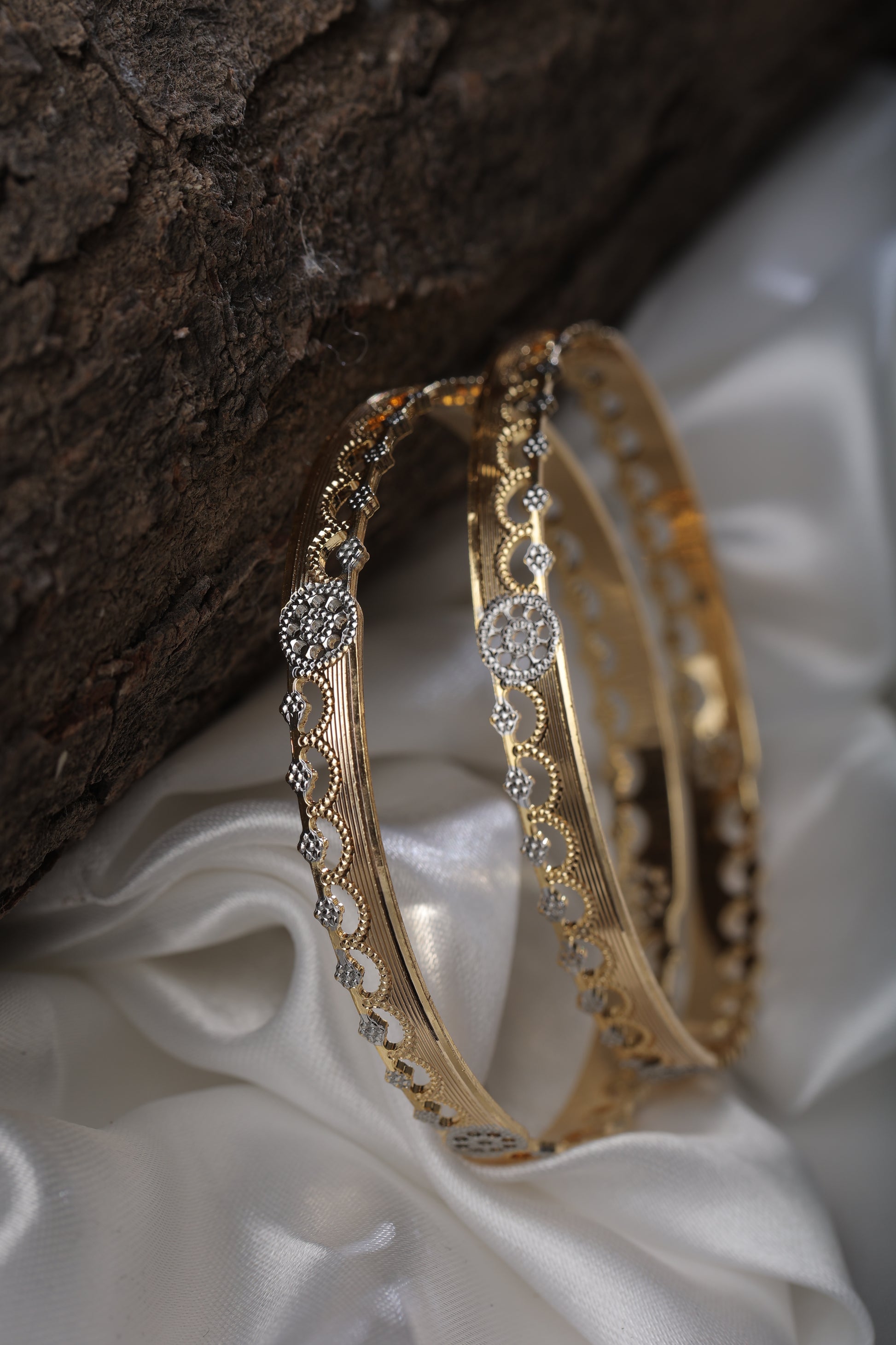 Indulge in luxurious, Micro gold plated bangles that are perfect for daily wear. With anti-tarnish and water-resistant properties, these bangles are allergy-free and available in all sizes. Elevate your style with these three tone lightweight, premium quality bangles that are perfect for any occasion. Experience the beauty and durability of these bangles for yourself.