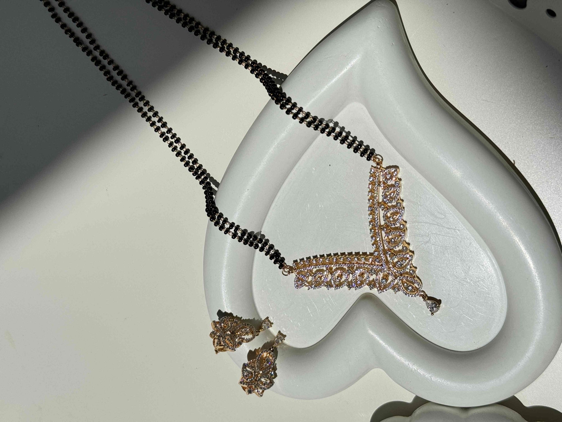 Enhance any outfit with our Micro Gold Plated CZ Diamond Mangal Sutra - perfect for everyday wear. This elegant piece, designed for women, features water-resistant and anti-tarnish qualities, making it a versatile accessory for any occasion. The timeless design is elevated by the addition of stunning black beads, and the necklace length of 20 inches is secured with a convenient hook lock. Truly a must-have for any jewelry collection.