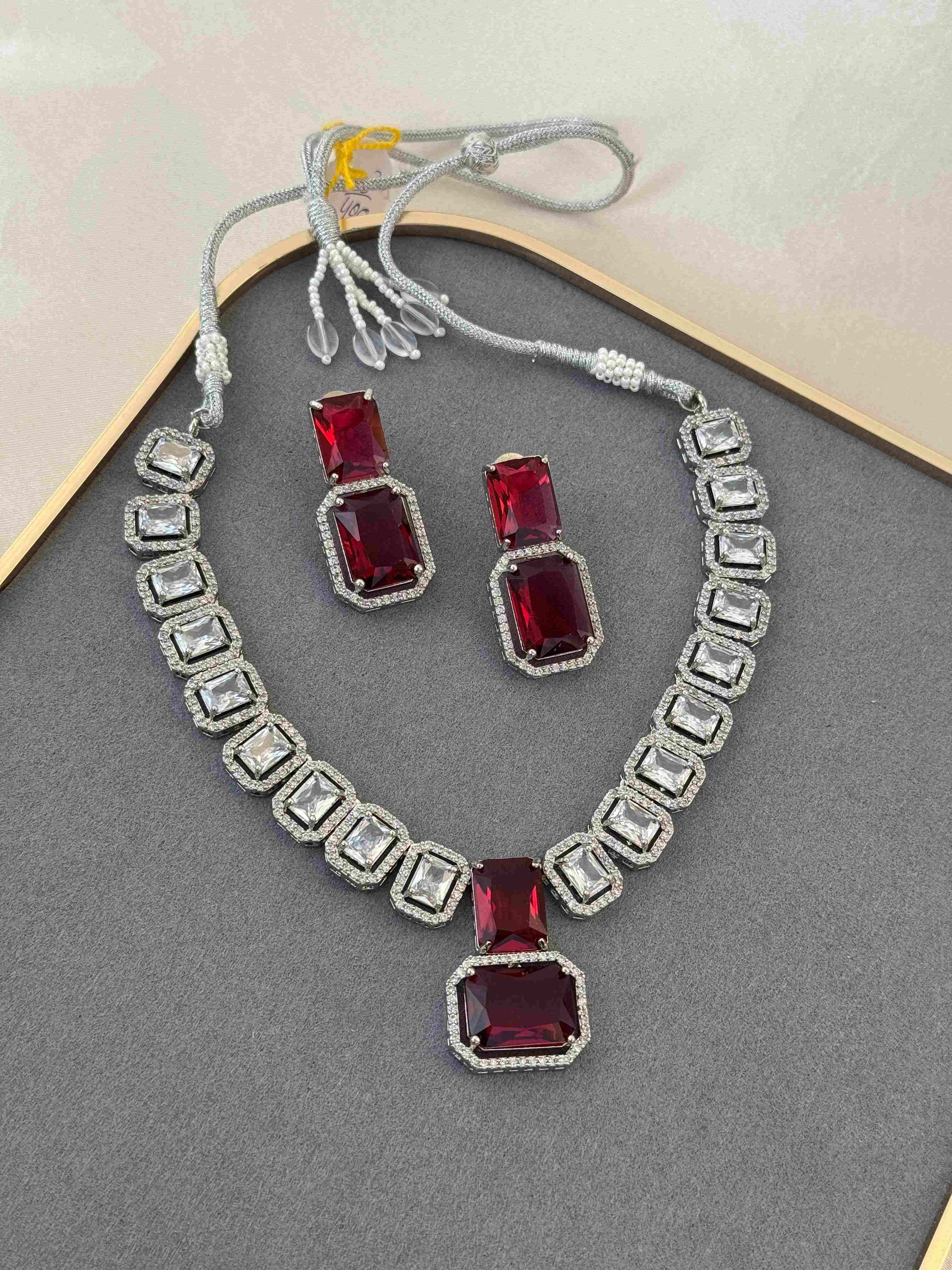 SQUARE RUBY DIAMOND SILVER PLATED NECKLACE SET